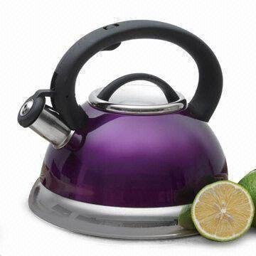 This 3.0-Quart tea kettle features a metallic colored powder coating over the heavy gauge stainless steel body. Fully encapsulated bottom allows for quick heating. Stay cool handle made pouring a breeze. Whistling spout notifies you when water is boiling. Metallic Purple color adds a pop of color to any kitchen.
